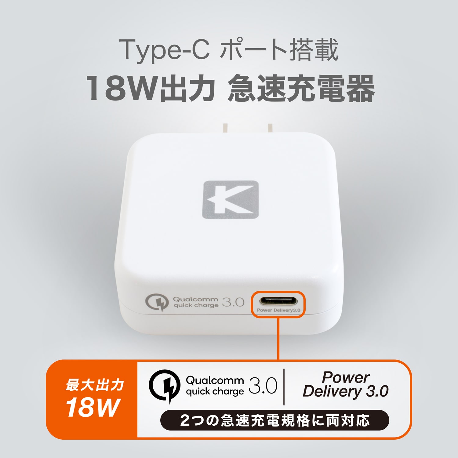 最大18W出力の充電器とUSB Type-C端子搭載の機器で使えるケーブルのセット
