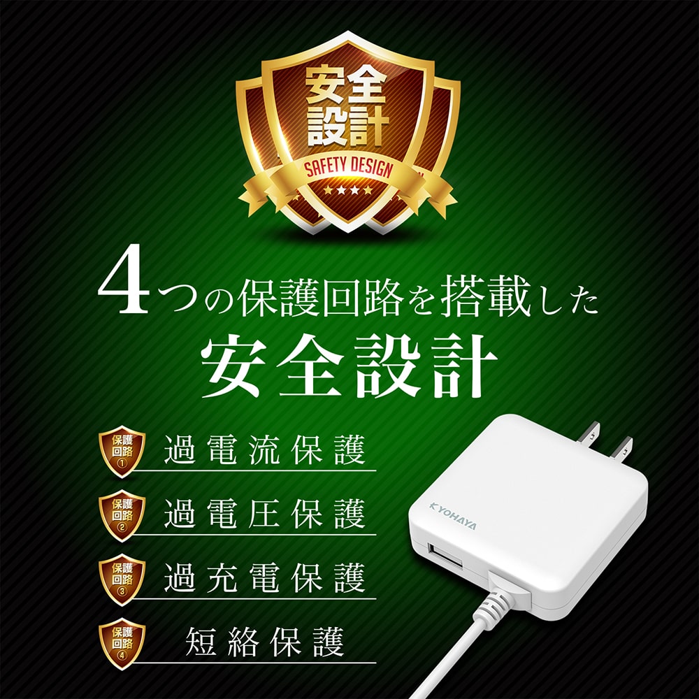 素早く機器を充電する最大出力5V/3Aの急速充電に対応しています。