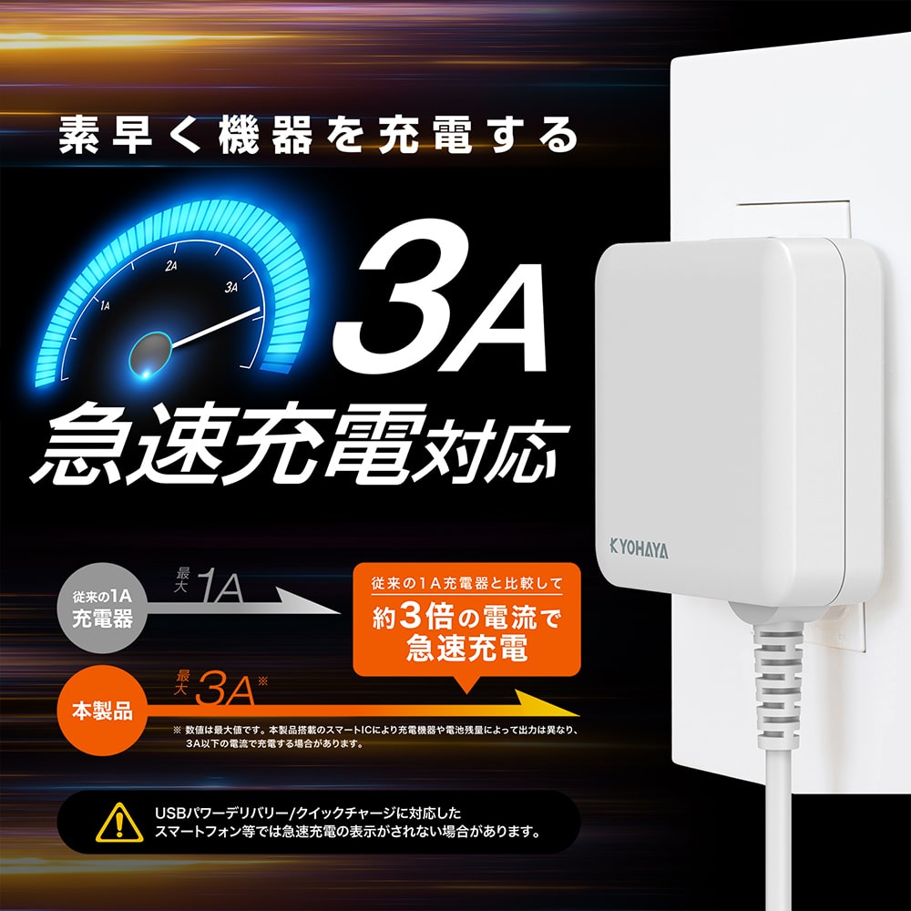 最大3A出力で急速充電対応