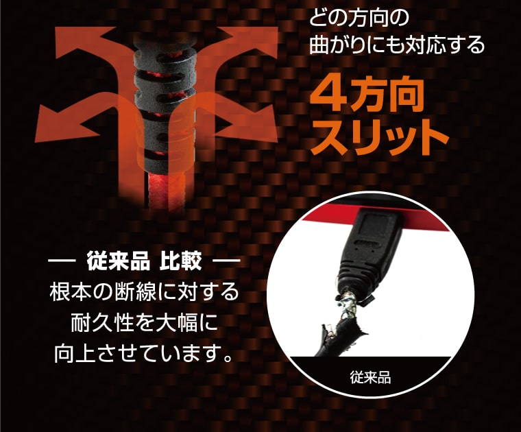 通常よりコネクタとケーブル接続部分のゴムカバーを長くすることで、コネクタにかかる負担を軽減します。 また、一番断線しやすい接続部分で5万回以上の折り曲げテストもクリアしている耐久性の高いケーブルです。(当社調べ)